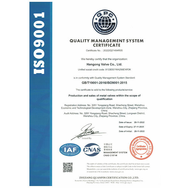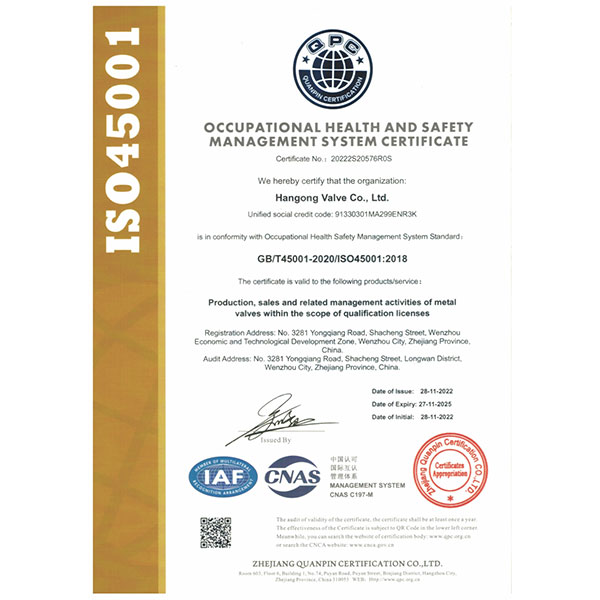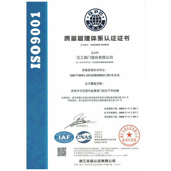 公司先后通過(guò)了ISO9001:2008國(guó)際質(zhì)量管理體系認(rèn)證,ISO4001:2004環(huán)境管理體系認(rèn)證,GB/T28001-2001職業(yè)健康安全管理體系認(rèn)證,中華人民共和國(guó)特種設(shè)備制造許可認(rèn)證(TS),中國(guó)石油和石油化工設(shè)備工業(yè)協(xié)會(huì)團(tuán)體會(huì)員單位,中國(guó)化工集團(tuán)公司合格供應(yīng)商成員單位,中國(guó)華電集團(tuán)公司集團(tuán)級(jí)供應(yīng)商成員單位,中國(guó)華能集團(tuán)公司供應(yīng)商,中國(guó)城市燃?xì)鈪f(xié)會(huì)團(tuán)體會(huì)員,中國(guó)建筑金屬結(jié)構(gòu)協(xié)會(huì)會(huì)員單位,中國(guó)著名品牌等這一系列的質(zhì)保體系是漢工閥門(mén)在設(shè)計(jì)、開(kāi)發(fā)、制造、銷(xiāo)售、服務(wù)于一體的后盾力量,確保了漢工閥門(mén)的質(zhì)量與品牌。